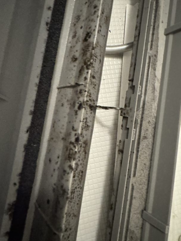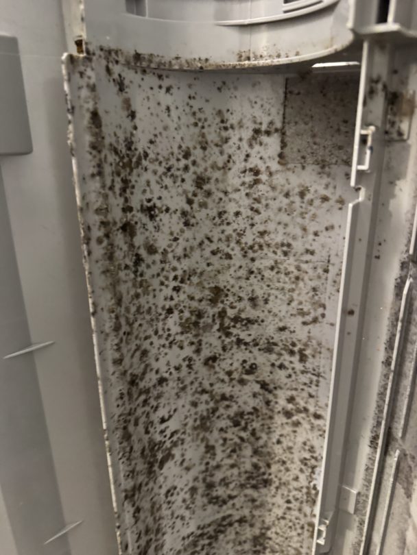 送風路もカビだらけです。通常分解では、送風路も半分くらいまでしか洗えません。